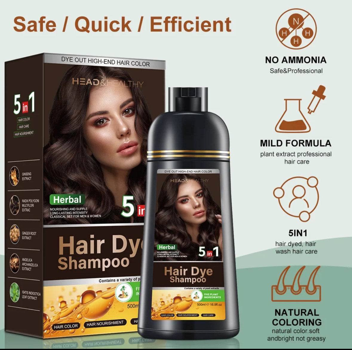 Head & Healthy 5-in-1 Herbal Hair Dye Shampoo – Natural Black Hair Color, Long-Lasting Grey Coverage, Nourishing & Sulfate-Free Formula (500ml) - Natural Black